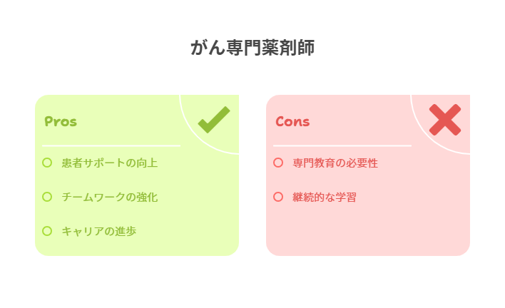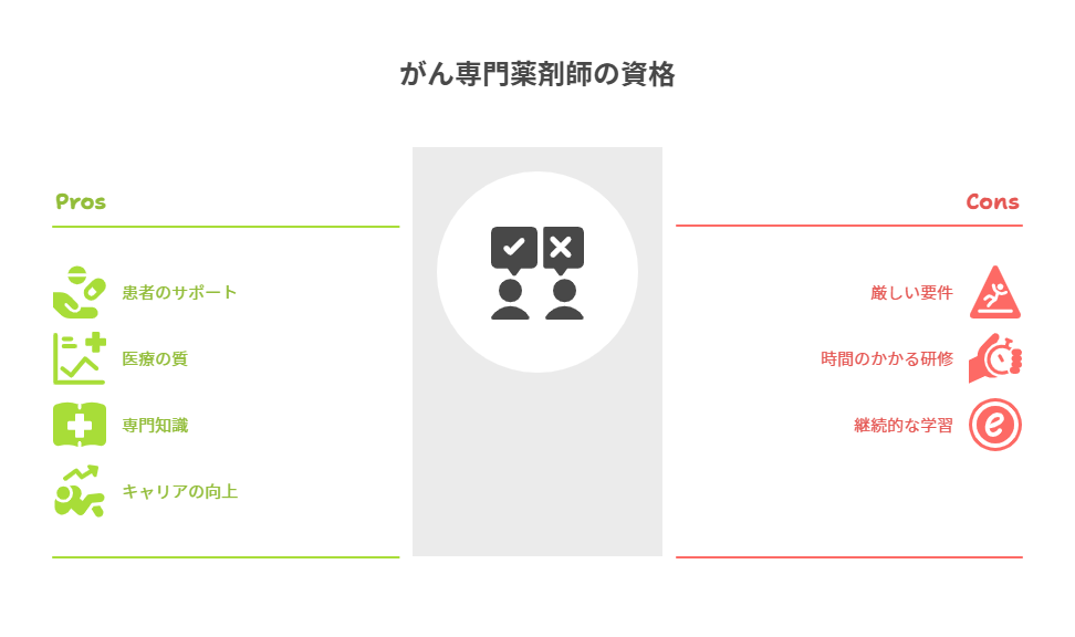 がん専門薬剤師としての資格を取得することは、キャリアの向上にもつながります。専門性を高めることで、薬局や病院での業務において重要な役割を果たすことができ、患者からの信頼も得やすくなります。また、地域医療への貢献を通じて、薬剤師としての社会的地位も向上するでしょう。