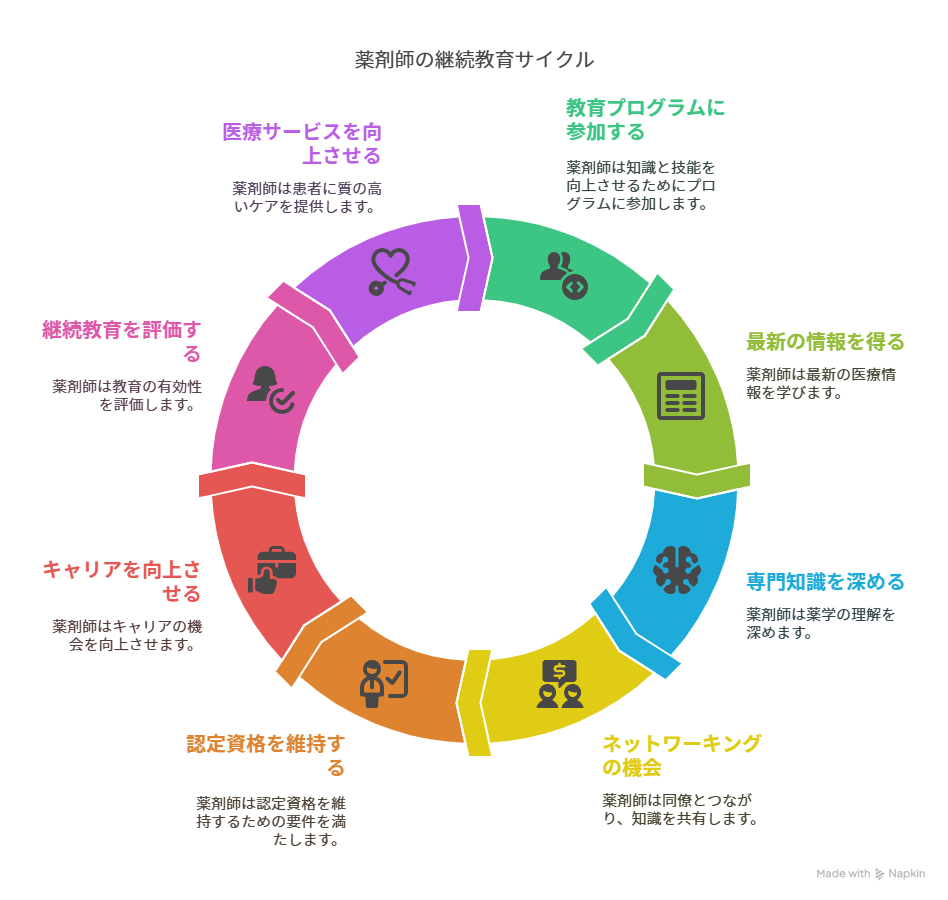 教育プログラムに参加することで、薬剤師は最新の情報を取得し、専門知識を深めることができます。また、他の薬剤師とのネットワーキングの機会もあり、実務に役立つ情報交換が行える点が大きなメリットです。さらに、プログラムを修了することで、認定薬剤師としての資格を維持するための要件を満たすことができ、キャリアの向上にも寄与します。