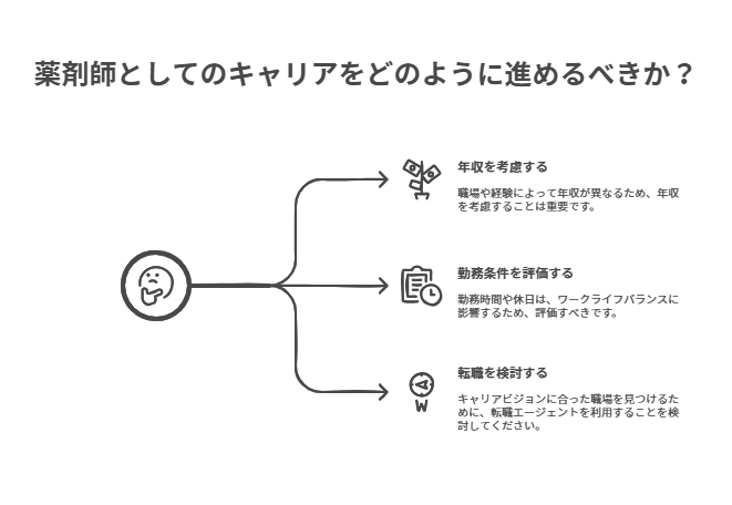 薬剤師としてのキャリアを考える際に転職を検討する場合、職場環境や年収、業務内容などをしっかりと確認することが大切です。また、自分のキャリアビジョンに合った職場を選ぶために、転職エージェントを利用するのも一つの手です。自分が求める条件を明確にすることで、より良い選択をすることができます。