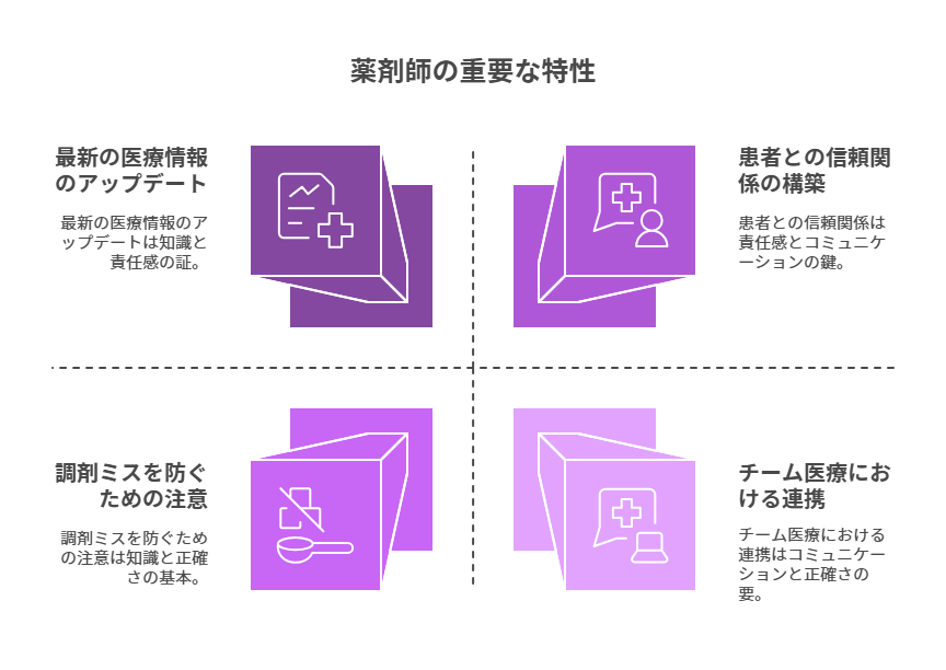 薬剤師は、患者の健康に直接関わる業務を行うため、高い責任感を持つことが重要です。調剤ミスや服薬指導の誤りは、患者の命に関わる事態を引き起こす可能性があるため、常に正確さを求められます。責任感を持って業務を遂行することで、患者の信頼を得ることができ、安心して治療を受けてもらうことができます。