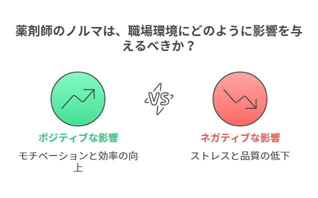 ノルマは、薬剤師の職場環境にも大きな影響を及ぼします。過度なノルマが課せられると、ストレスやプレッシャーを感じることが多くなり、業務の質が低下する可能性もあります。一方で、適切なノルマはモチベーションを高め、チーム全体の士気を向上させる要因ともなり得ます。企業は、ノルマを設定する際に、その影響を十分に考慮し、薬剤師が働きやすい環境を整えることが求められます。