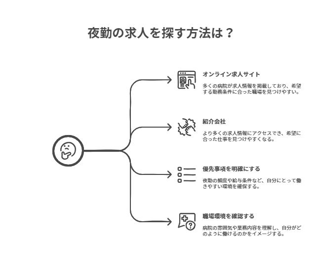 希望する勤務条件に合った職場を見つけるためには、まず自分の優先事項を明確にすることが重要です。例えば、夜勤の頻度や勤務時間、給与条件などを考慮し、自分にとって働きやすい環境を探すことが必要です。条件に合った職場を見つけるためには、求人情報を細かくチェックし、必要に応じて相談を行うことも大切です。
