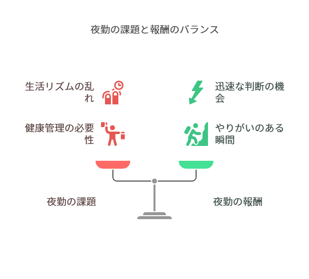 夜勤勤務は生活リズムに大きな影響を及ぼします。深夜に働くことで、通常の生活パターンが乱れがちですが、適切な睡眠管理や食事の工夫をすることで、健康を維持することが可能です。夜勤を行う際は、特に体調管理に気を付ける必要があります。