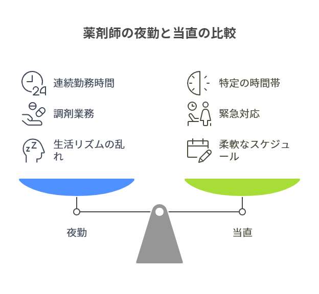 夜勤と当直は、薬剤師の勤務形態において異なる概念です。夜勤は主に深夜の時間帯に勤務することを指し、通常は24時間体制の病院で行います。一方、当直は特定の時間帯に勤務し、主に急変時の対応を担当します。つまり、夜勤は連続した勤務時間が多いのに対し、当直は特定の時間に勤務するため、勤務時間が異なります。