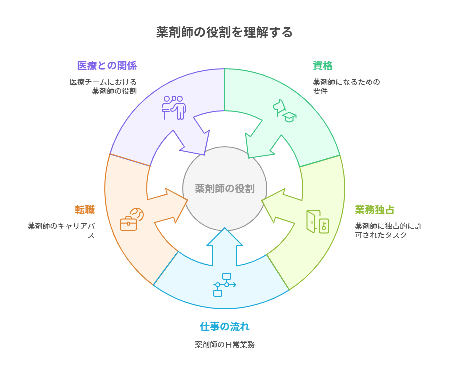 薬剤師の業務独占に関する法律は、薬剤師法をはじめとする多くの法令に基づいています。これらの法律は、薬剤師が行う業務の範囲や責任を明確にし、医療の質を保つための規制を設けています。薬剤師は、これらの法律を遵守し、適切な業務を行うことで、患者に対して安全で信頼性の高い医療サービスを提供することが求められます。