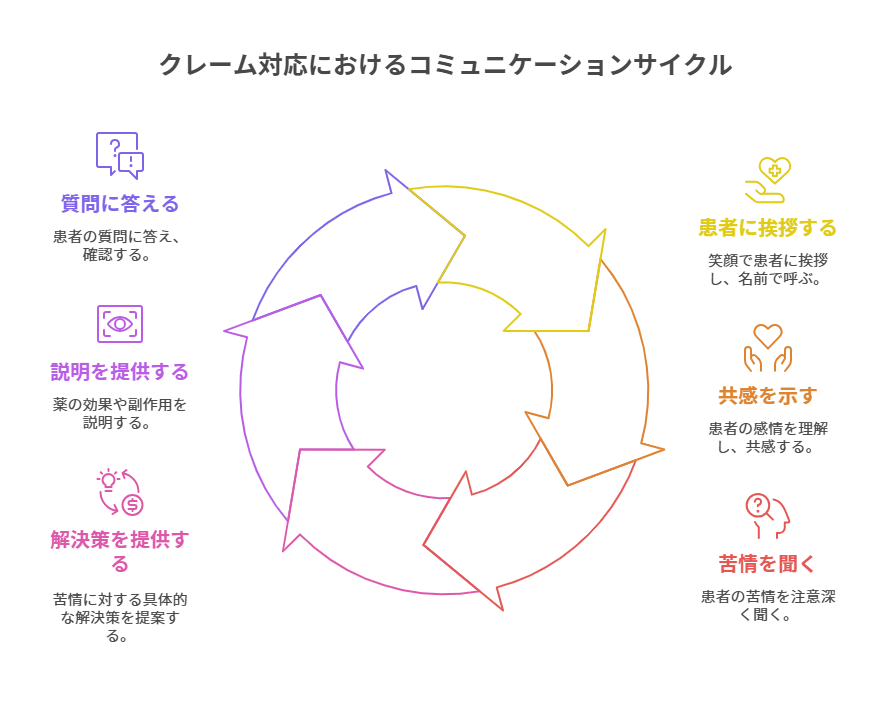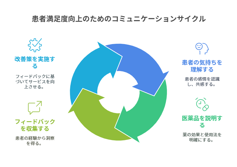 コミュニケーションの質を向上させるためには、相手の気持ちを理解する姿勢が大切です。薬剤師は、患者の話をしっかりと聞き、共感を示すことで信頼関係を築くことができます。また、患者の不安や疑問に対して丁寧に答えることで、より良いコミュニケーションが可能です。こうした質の高いコミュニケーションは、クレームの発生を防ぎ、患者満足度の向上にも寄与します。