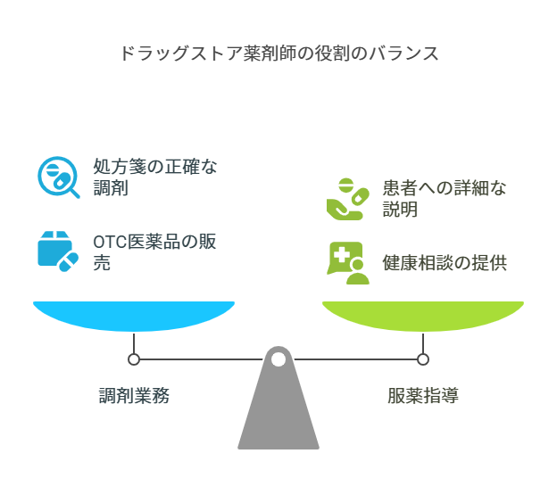 ドラッグストアでの薬剤師の主な仕事は、調剤業務と服薬指導に分けられます。調剤薬局においては、処方箋に基づいて薬を調剤することが基本的な業務です。薬剤師は、患者が服用する薬の種類や用量を確認し、正確に調剤する必要があります。また、調剤業務においては、OTC医薬品の販売や健康相談も重要な役割です。患者の健康状態や服薬歴に基づいて、適切な医薬品を提案することで、患者の健康改善に寄与します。